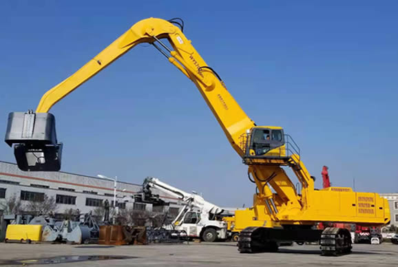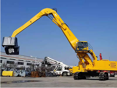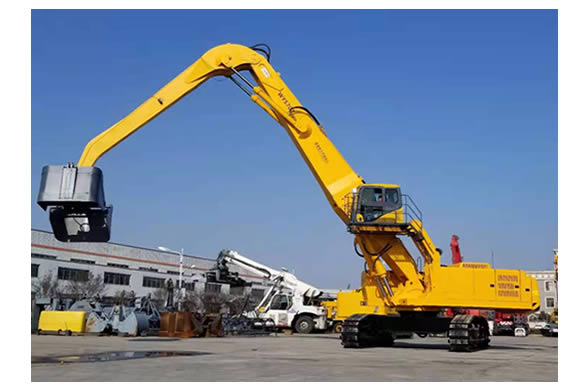 該設(shè)備分別采用了大功率“國三”標(biāo)準(zhǔn)發(fā)動機、380V 西門子電機,以及全套采用施耐德控制系統(tǒng)拖動控制兩套力士樂液壓動力機構(gòu)及先導(dǎo)液力控制的世界首臺“雙動力”抓料機。該機設(shè)計了寬體結(jié)構(gòu)梁,以及加強型可更換正、負(fù)差的二節(jié)式作業(yè)主臂,最大吊重量達(dá) 25 噸、最大作業(yè)半徑為 18米。在 5 至 12 米作業(yè)半徑內(nèi),可配備 5.0 立方蚌殼抓斗,或 2.5 立方梅花廢鋼抓斗。